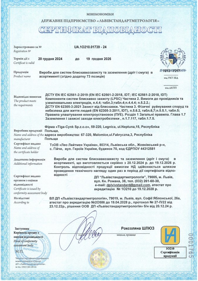 Сертифікат відповідності на продукцію Tiga-Cynk (Польща)